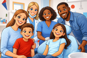 “Illustration of a happy family and pediatric dental team in a dental office”